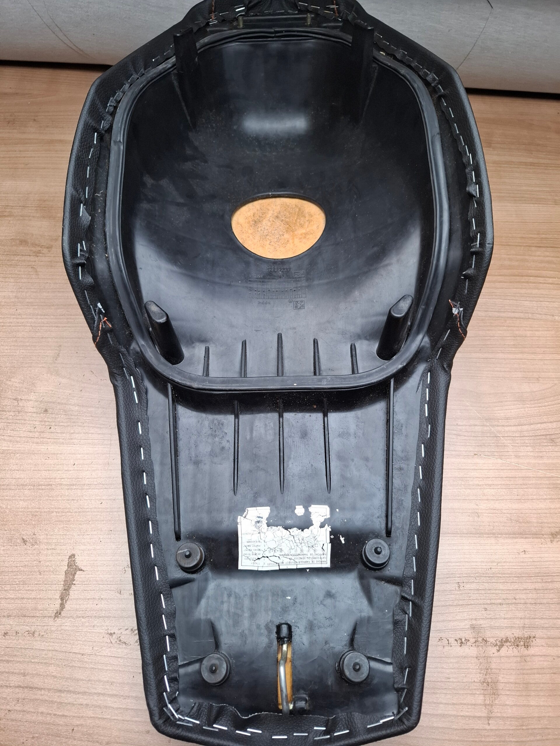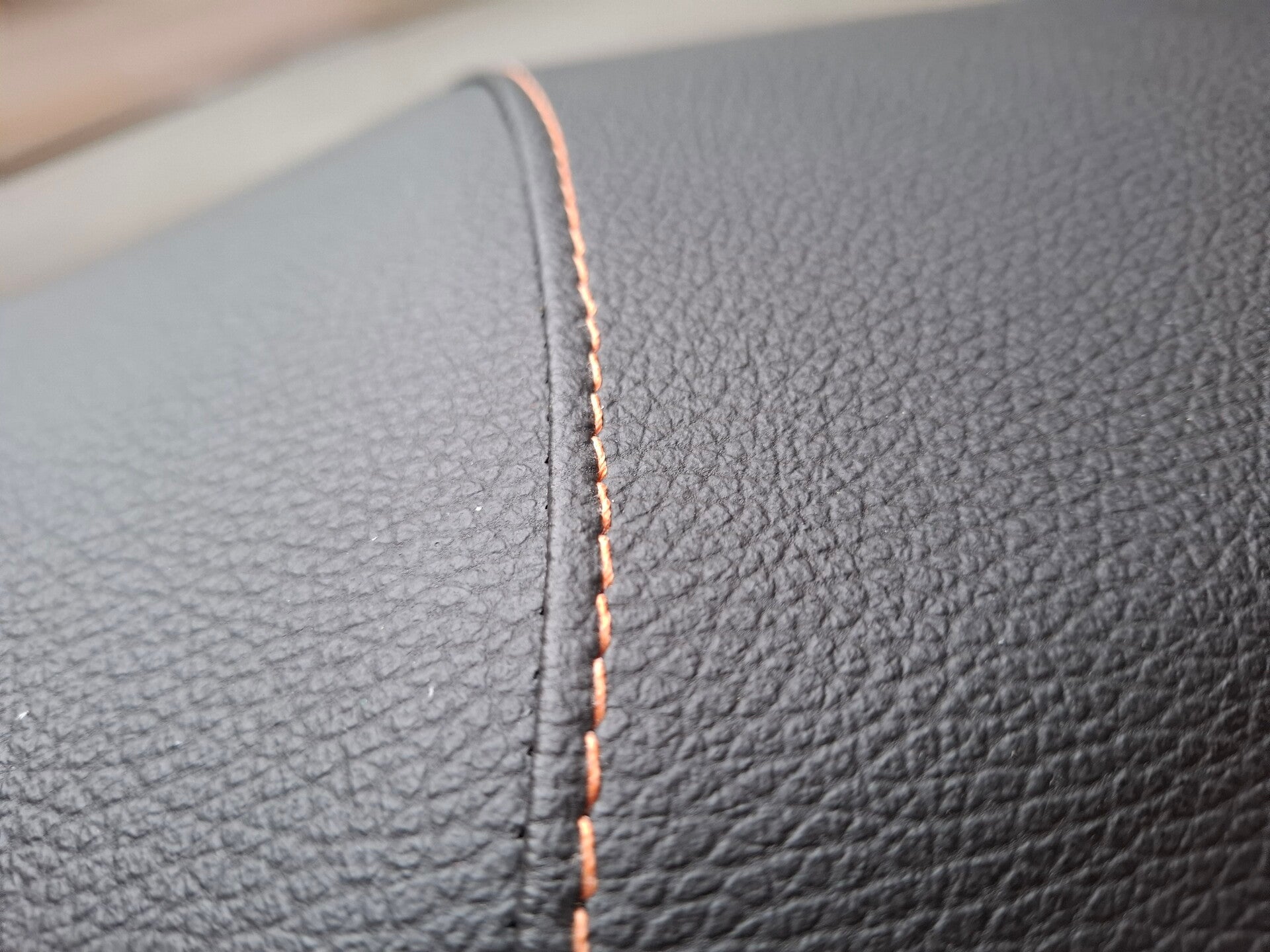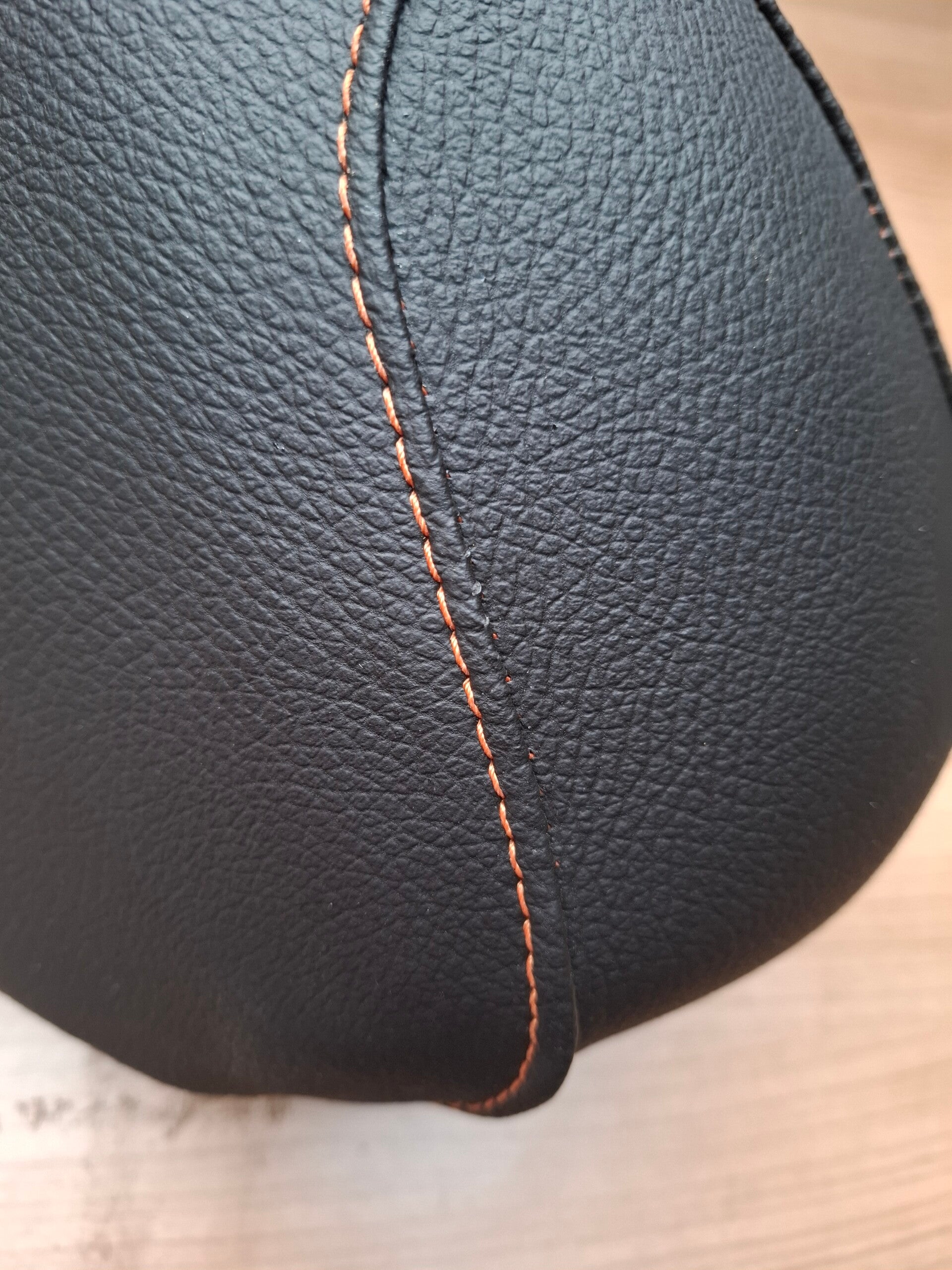 Kleur: zwart skai-leer met oranje sierstiksel.