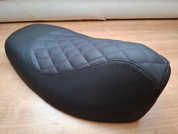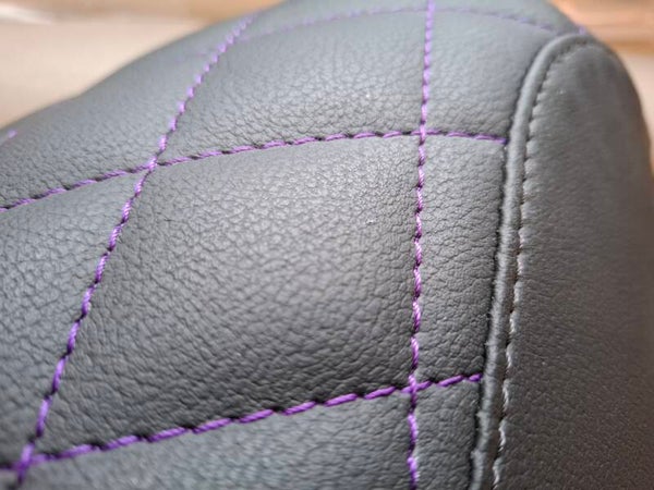 Kleur: zwart skai-leer, zitvlak met paarse stiksels in ruitvorm.