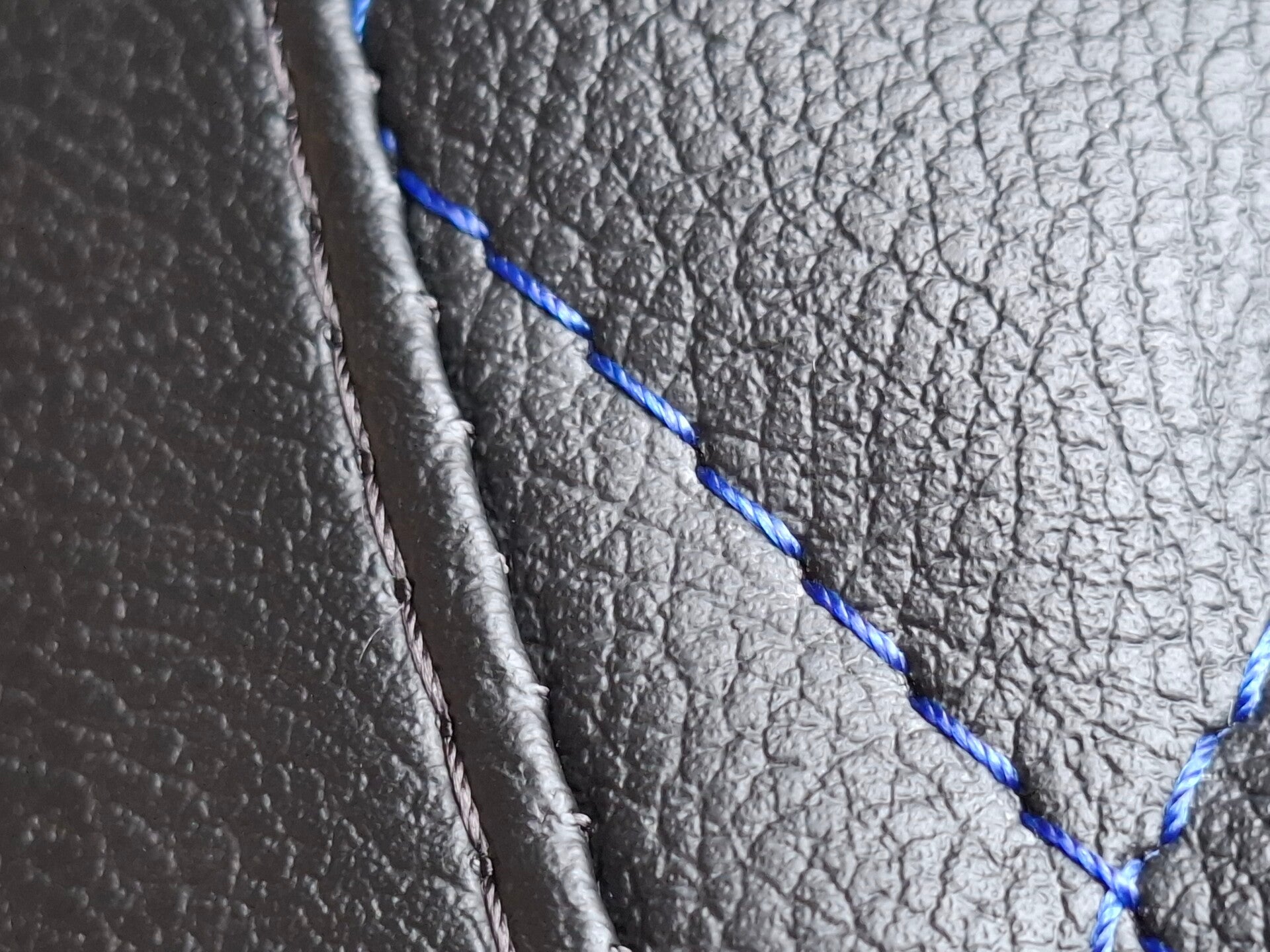 Kleur: zwart, blauwe sierstiksels in ruitvorm.