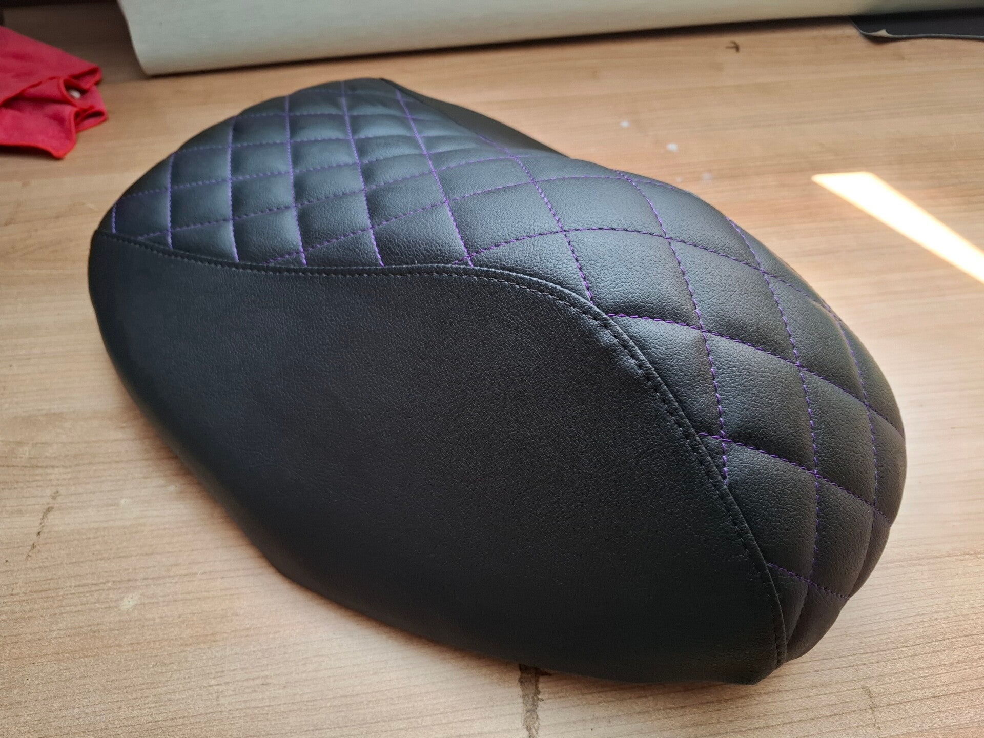 Kleur: zwart skaileer, paarse stiksels in ruitvorm.