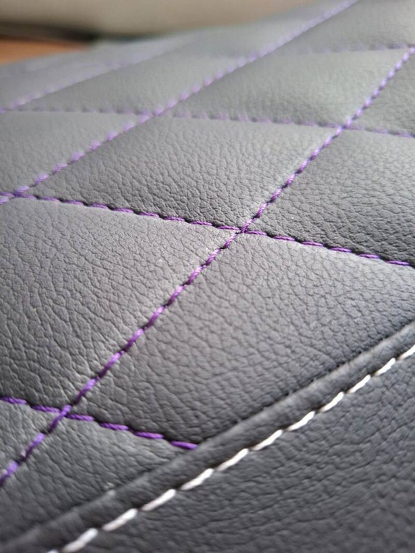 Kleur: zwart skaileer, paarse stiksels in ruitvorm. Afgewerkt met een witte siernaad aan de zijkanten.